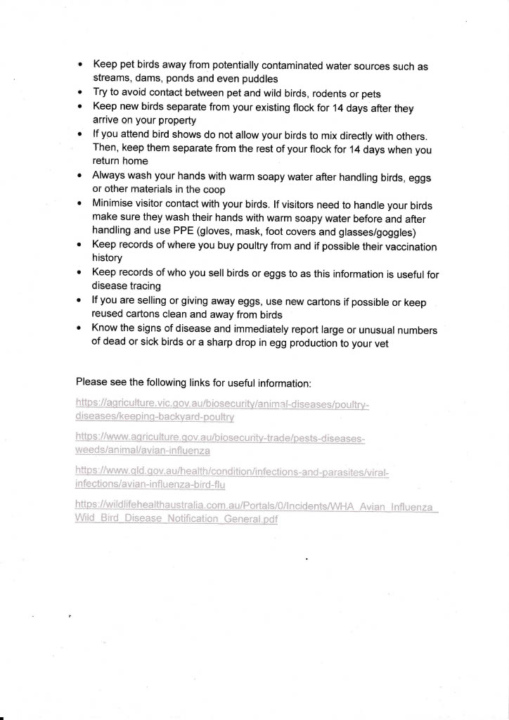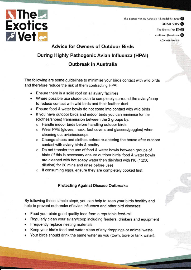 Please find attached our clinic advice during the current Highly Pathogenic Avian Influenza outbreak in Australia. We are fortunate in Qld to have some planning time before the virus is seen in outbreak proportions as has already been in the case in ACT, VIC and NSW. Outdoor birds are at risk of contracting the virus from wild birds in the form of inhaled feather dust and ingestion of faecal, reproductive or oral secretions. We have included some precautions you may wish to put in place to minimise your bird(s) exposure to Avian Influenza.